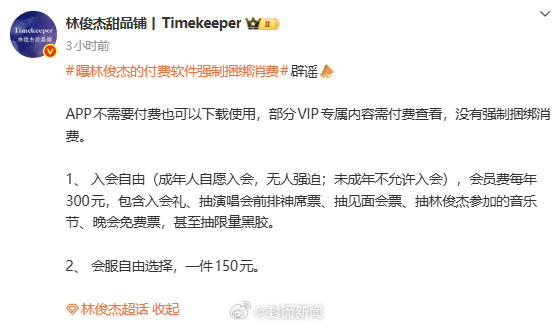 [#粉丝称林俊杰APP入会自由无捆绑#]#粉丝怒问林俊杰究竟挡了谁的道#近日,有消息称海证资本,“林俊杰的付费软件强制捆绑消费”引发关注。@林俊杰甜品铺丨Timekeeper辟谣📣称:“林俊杰究竟挡了谁的道?APP不需要付费也可以下载使用,部分VIP专属内容需付费查看,没有强制捆绑消费。